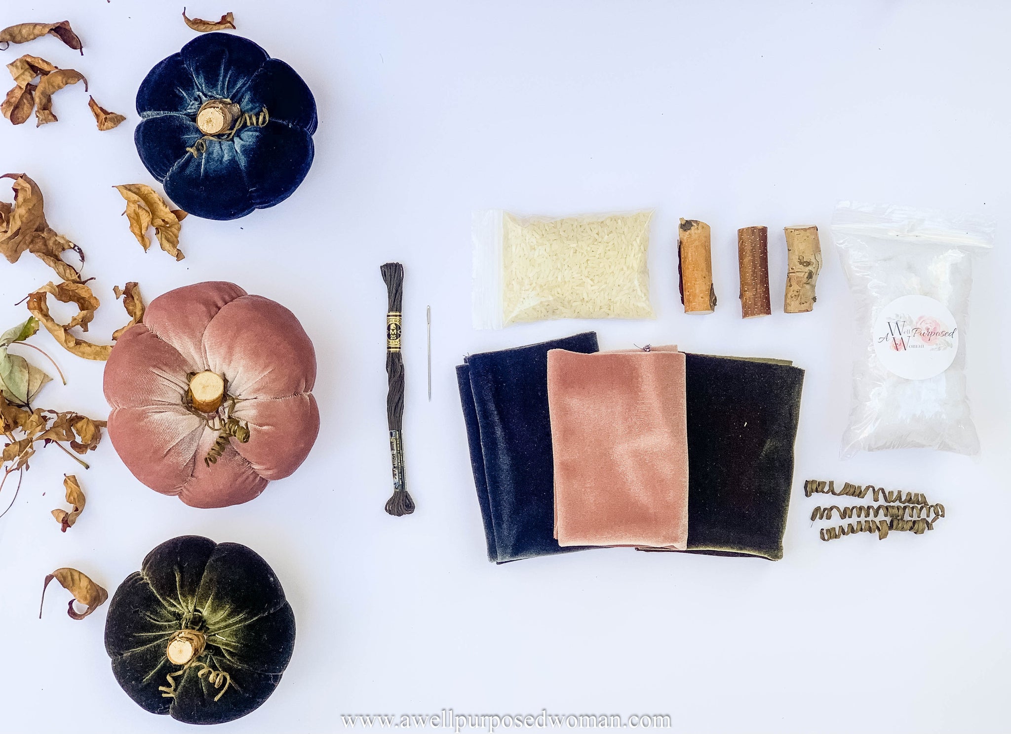 This kit makes 3 velvet pumpkins (1 navy, 1 dark green, 1 dusty rose)!